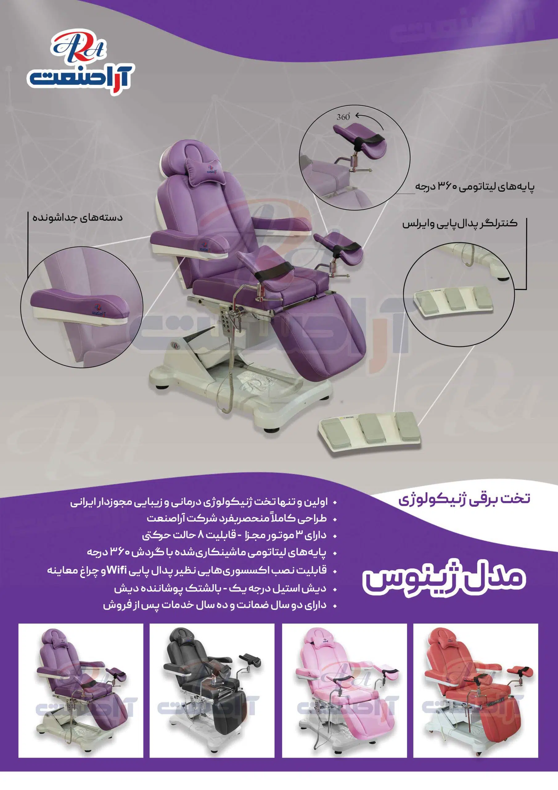 برای خرید تخت ژنیکولوژی نو در ابتدا باید به مجوز مجموعه مورد نظر توجه داشته باشید. استفاده از یک تخت ژنیکولوژی که دارای تمامی نشانهای استاندارد داخلی و بینالمللی باشد، خیال شما و مراجعینتان را از هر بابت آسوده خواهد ساخت. در حال حاضر شرکت تولیدی آراصنعت طب آسیا، نخستین و تنها شرکتی است که از اداره کل تجهیزات پزشکی مجوز تولید تخت ژنیکولوژی را دریافت کرده است. تختهای ژنیکولوژی تولیدشده توسط شرکت آراصنعت، در دو نوع تخت سه موتوره برقی و مکانیکی عرضه میشوند. همچنین جدیدترین تخت ژنیکولوژی با فناوریهای روز دنیا توسط شرکت آراصنعت، طراحی و تولید گردیده است.