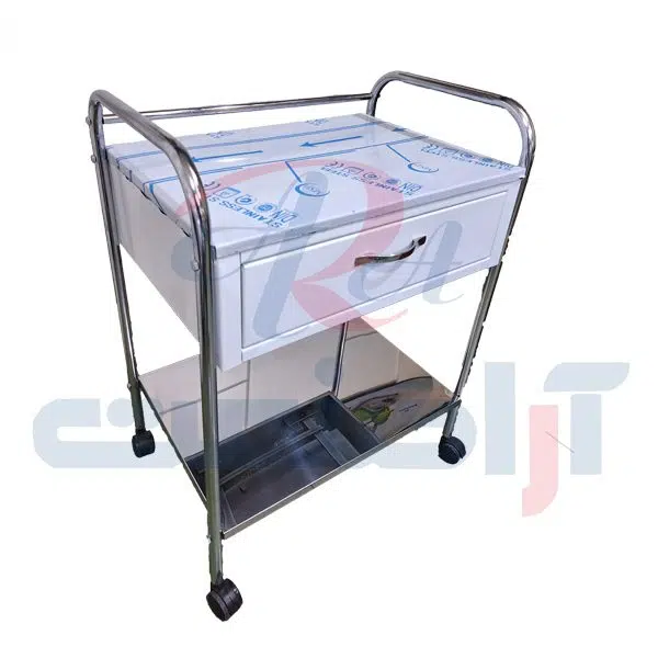 ترالی پزشکی پانسمان کشودار یکی از تجهیزات پر مصرف در تمامی مراکزهای درمانی میباشد. ترالی پانسمان یک کشو آرا صنعت بسیار کاربردی است زیرا علاوه بر داشتن یک کشو جادار و دو سطح گسترده، فضای بسیار کمی را اشغال میکند. در نتیجه، اگر مشکل کمبود فضا دارید، حتما از ترالی یک کشو آراصنعت استفاده نمایید. دو سینی مسطح نیز، این امکان را به شما میدهد تا تجهیزات موردنیاز آن را روی آن قرار دهید.